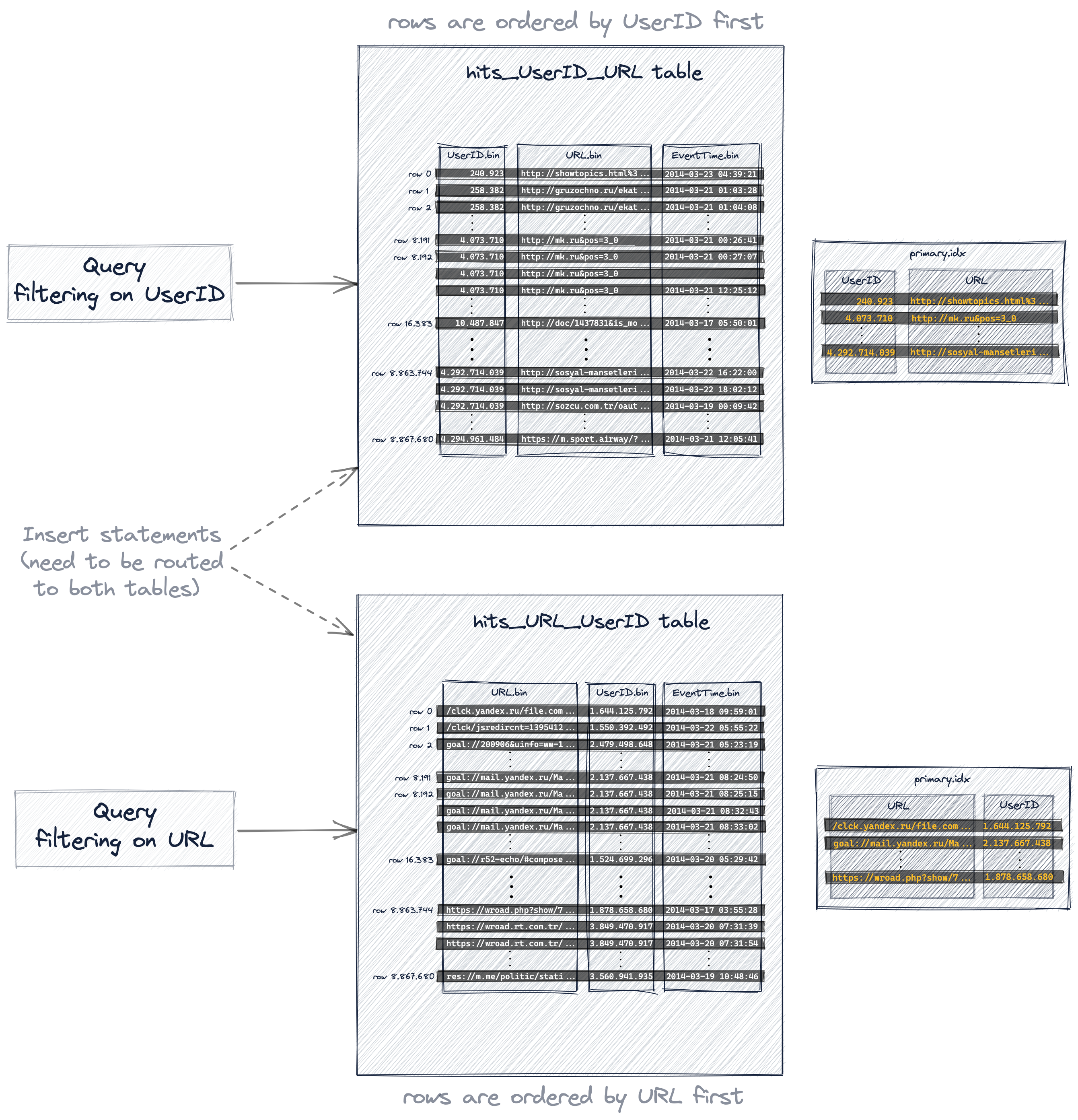 • a query is always (syntactically) targeting the source table hits_UserID_URL, but if the row order and primary index of the hidden table allows a more effective query execution, then that hidden table will be used instead