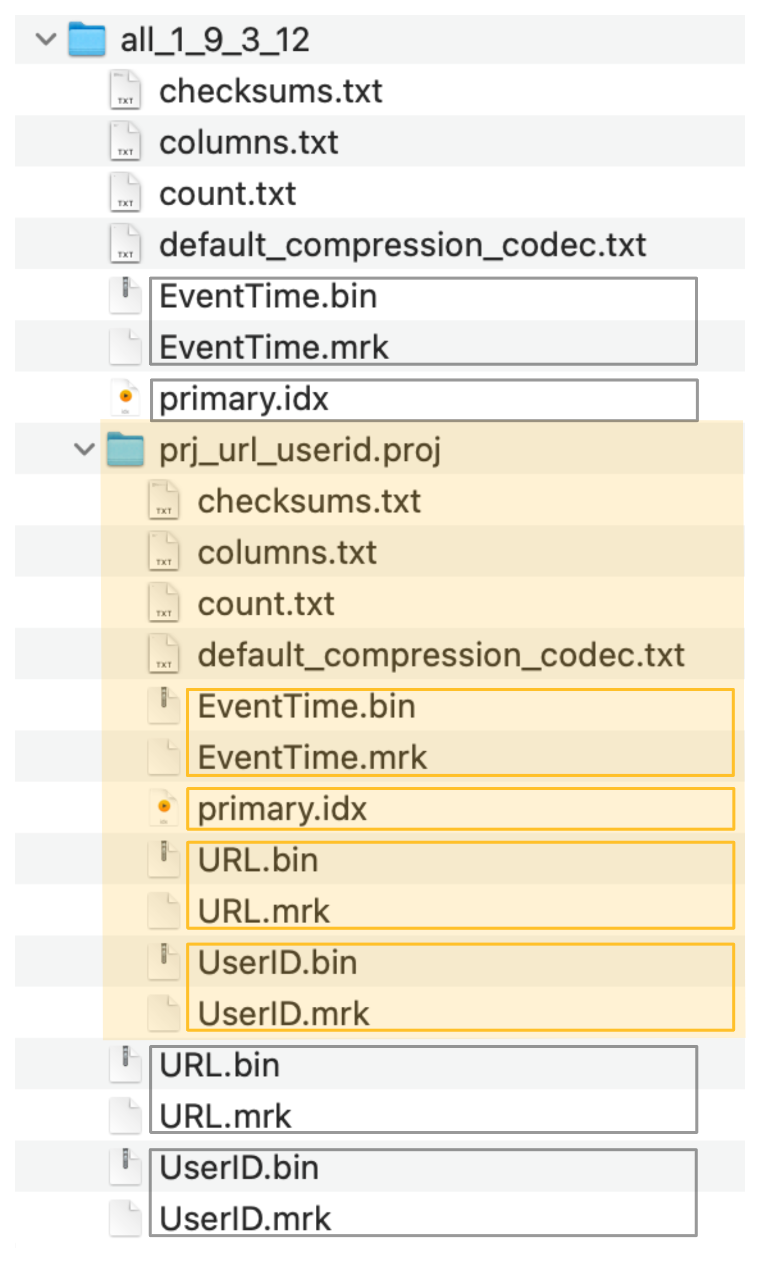 ClickHouse is storing the column data files (.bin), the mark files (.mrk2) and the primary index (primary.idx) of the hidden table in a special folder (marked in orange in the screenshot below) next to the source table's data files, mark files, and primary index files:
